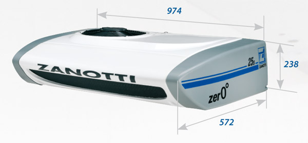 Рефрижератор Zanotti Zero 25s – холодильный агрегат с прямым приводом компрессора от двигателя автомобиля. Предназначен для автоматического поддержания температурного режима при транспортировке скоропортящихся продуктов в изотермических кузовах объемом от 13 до 24 куб.м